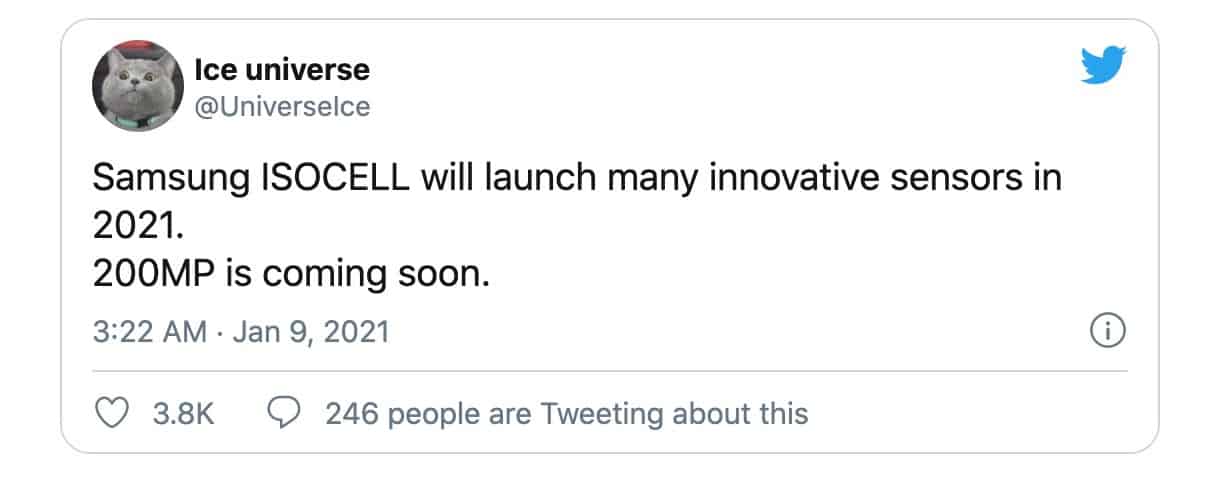 O leakster Ice Universe confirma isto. Assim afirma que a Samsung vai lançar novos sensores este ano, o primeiro dos quais seria uma unidade de 200MP. De facto, o mais recente leak parece sugerir que o sensor de 200MP da Samsung está ao virar da esquina. Isto significa que o veremos em ação em breve. Não foi fornecida mais nenhuma informação.