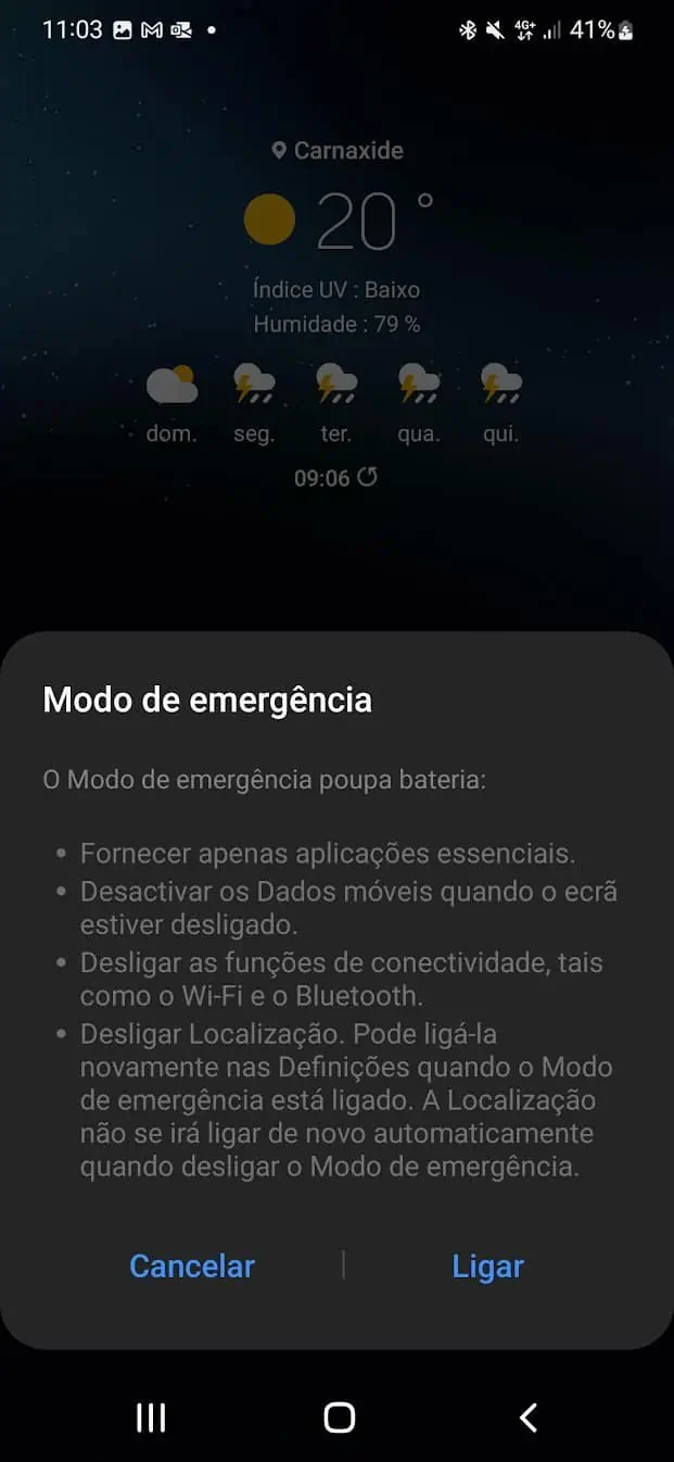 Quando ativamos o modo De Emergência, o seu smartphone reduz as atividades que podem drenar a sua bateria. Assim diminui-se o brilho do ecrã, muda o tema para modo escuro, reduz a resolução do ecrã e apenas permite utilizar aplicações essenciais específicas.