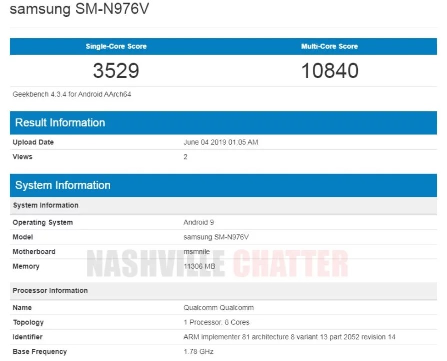 O SM-N976V Galaxy Note 10 5G é um modelo da Verizon que aposta no chipset Snapdragon 855. O chipset surge com o nome de código “msmnile” na listagem do Geekbench. A isto juntam-se 12 GB de RAM. Entretanto, este dispositivo aposta no Android 9 Pie.