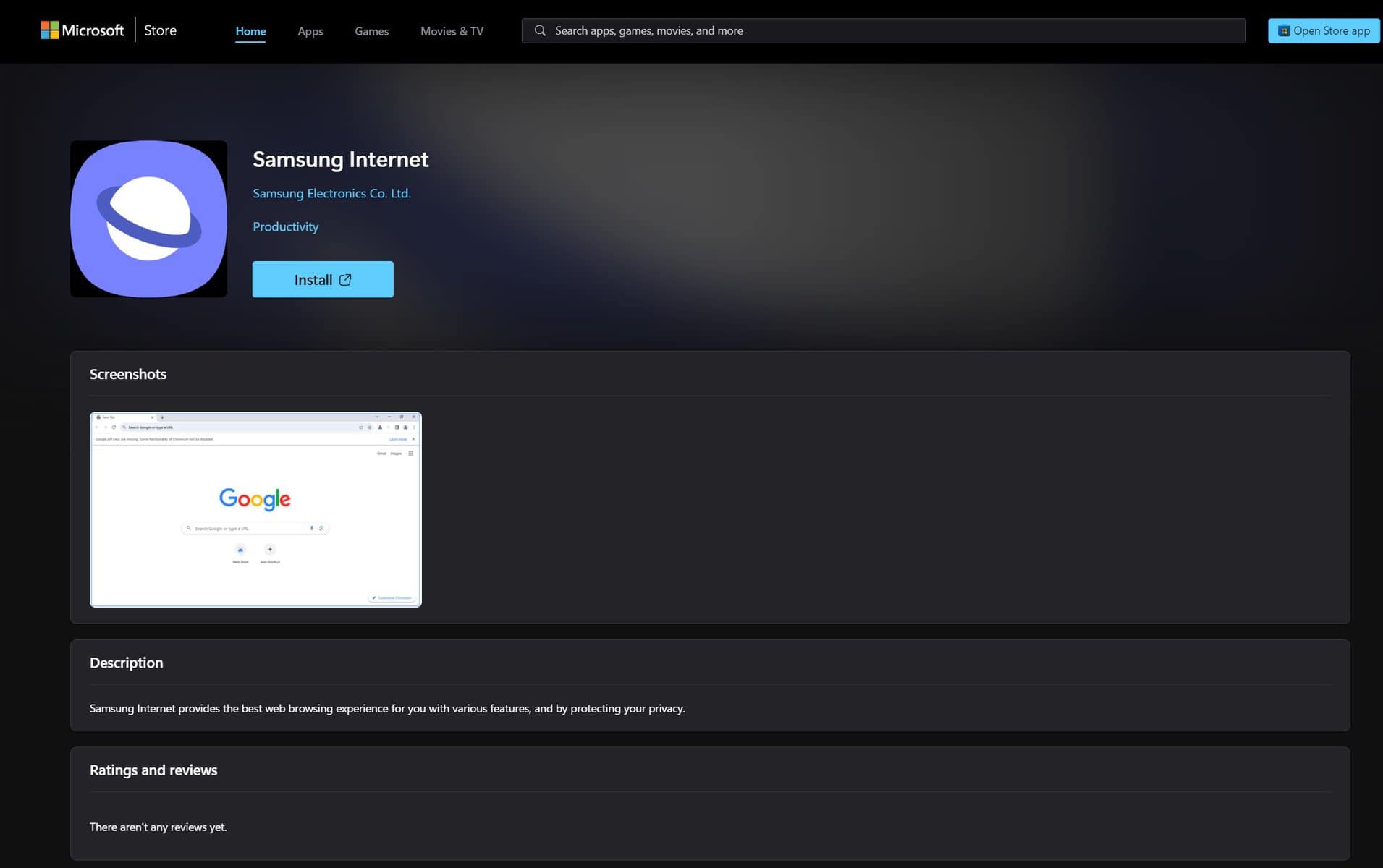 Para verificar o Samsung Internet, visite esta ligação no seu PC para o instalar através da Microsoft Store. Como mencionado anteriormente, pode instalá-lo em qualquer PC ou portátil. Não é necessário um portátil Galaxy nem qualquer hardware específico, mas é necessário ter o Windows 10 ou o Windows 11.
