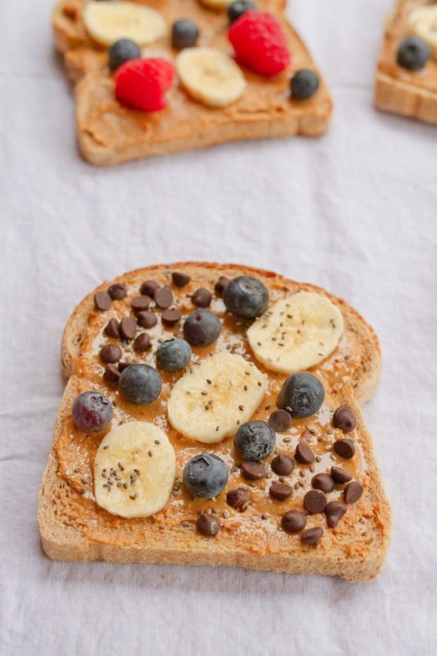 - 1 fatia de pão de alfarroba com manteiga de amendoim e mirtilos
