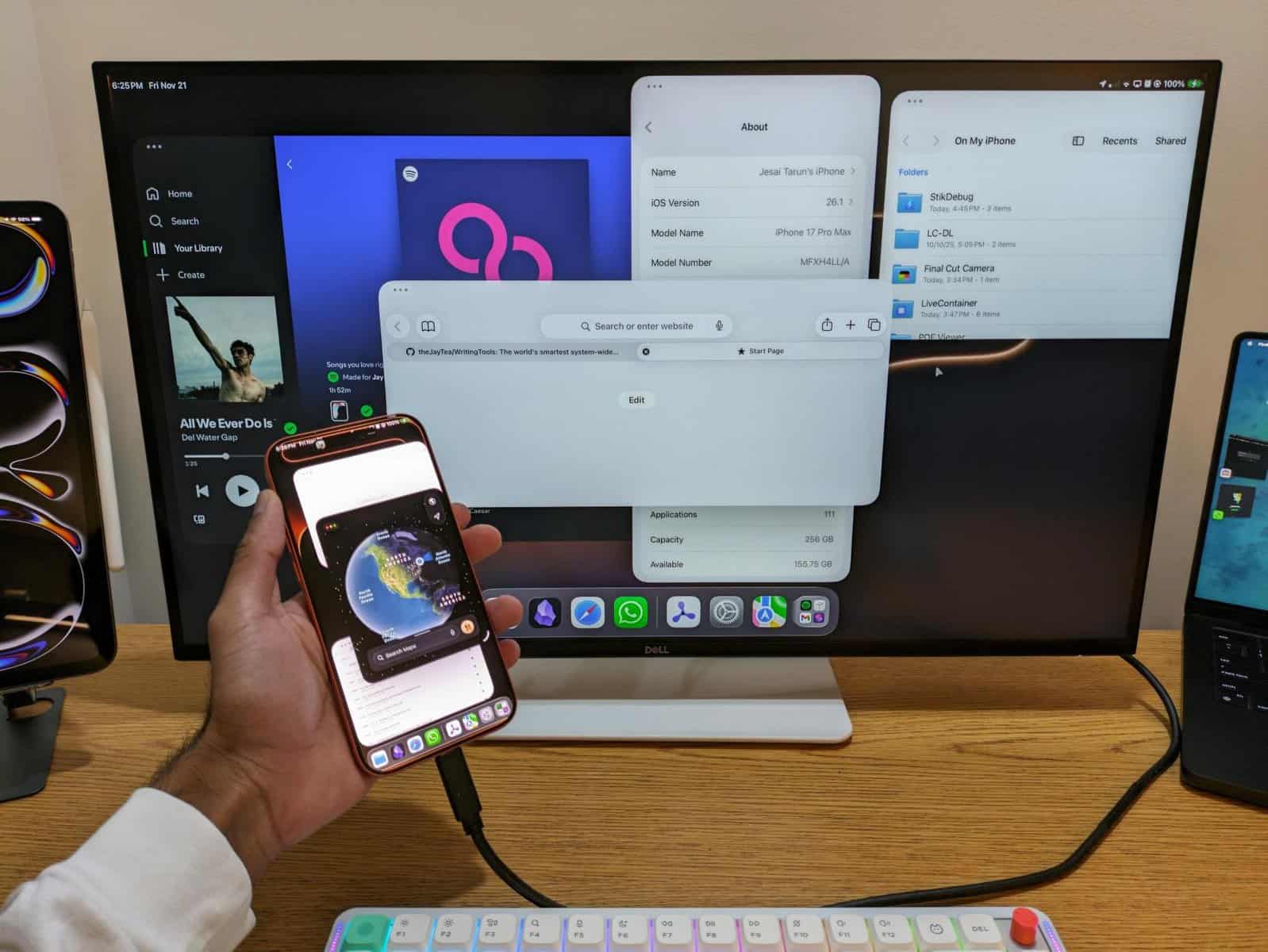 O telefone foi ligado a um monitor externo e transformou-se num “Mac de bolso”, com janelas abertas lado a lado e multitasking total. Ou seja, aquilo que tanta gente pede há anos e a Apple insiste em dizer que “não faz sentido num iPhone”.