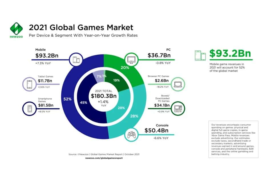 Olhando mais especificamente para os valores, a indústria dos jogos detém atualmente 52% do mercado, e a receita total que trouxe ao longo de 2021 não foi inferior a 90 milhões de dólares. Além disso, os jogos móveis são também a indústria que mais cresce e espera-se apenas que continue a crescer. Isto porque a indústria de smartphones continua a aumentar em todo o mundo.