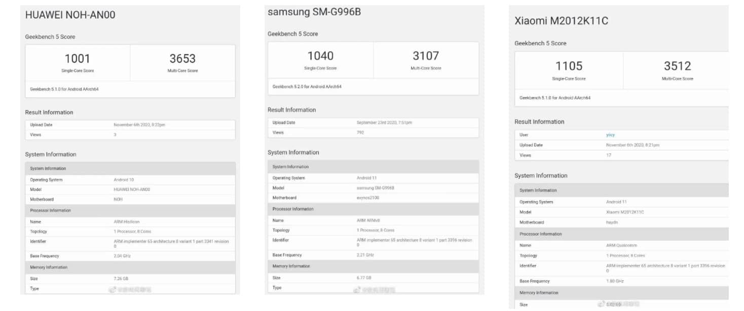 Olhando para os testes de núcleo único, o Snapdragon 875 lidera com 1105 pontos. O Exynos 2100 é o segundo com 1140 pontos, enquanto o Kirin 9000 atingiu 1001 pontos. No entanto, especula-se que no caso do SD875 e o Exynos 2100 a pontuação single-core vai melhorar na versão final.