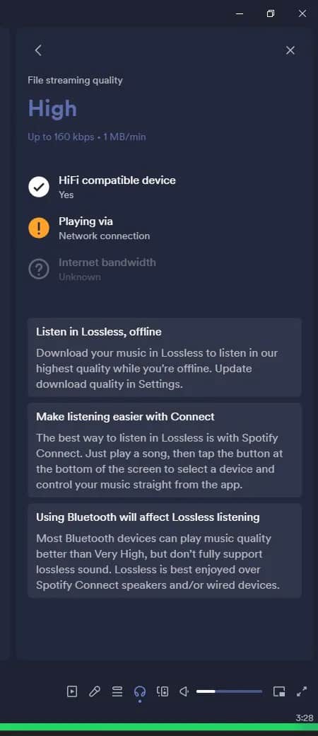 Como podemos ver na captura de ecrã acima, a música sem perdas no Spotify virá com um verificador de compatibilidade, permitindo-lhe saber o estado de compatibilidade do seu dispositivo de audição, da sua ligação e da sua largura de banda. Podemos ver vários painéis de aviso que informam os utilizadores sobre a possibilidade de ouvir música sem perdas quando estão offline e que ouvir música sem perdas através de Bluetooth não lhes proporcionará a melhor experiência.