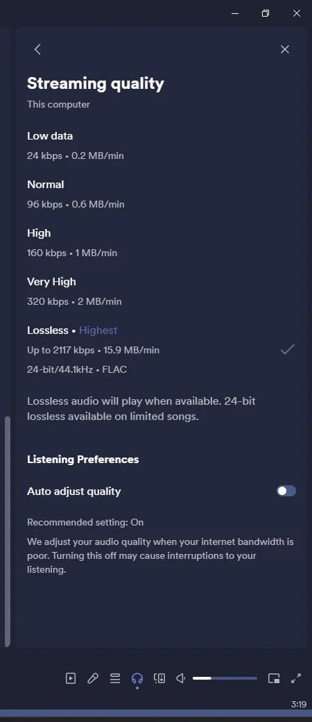 A qualidade de transmissão de ficheiros que pode esperar com o Lossless pode ir até 1.411 kbps, o que é significativamente superior à definição Muito Alta, que transmite a 320 kbps. Além disso, pode ir até aos 2.117 kbps, registando até 15,9 MB por minuto com o Lossless. O Spotify também menciona que mesmo o lossless de 24 bits está disponível em músicas limitadas reproduzidas através do formato de áudio FLAC.