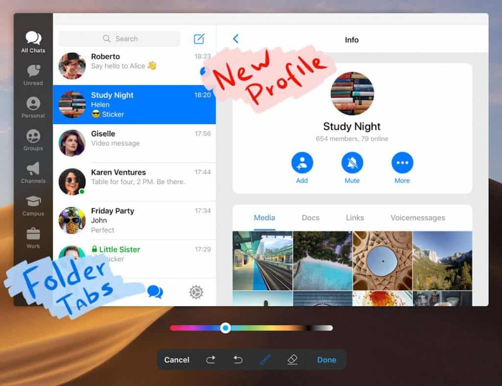 Os utilizadores do Telegram para Android têm direito também a um novo menu de anexos na conversa, onde todas as seções são reveladas de uma só vez. Já os utilizadores do cliente do Telegram para macOS terão acesso à pasta multimédia partilhada diretamente nas novas páginas de perfil.
