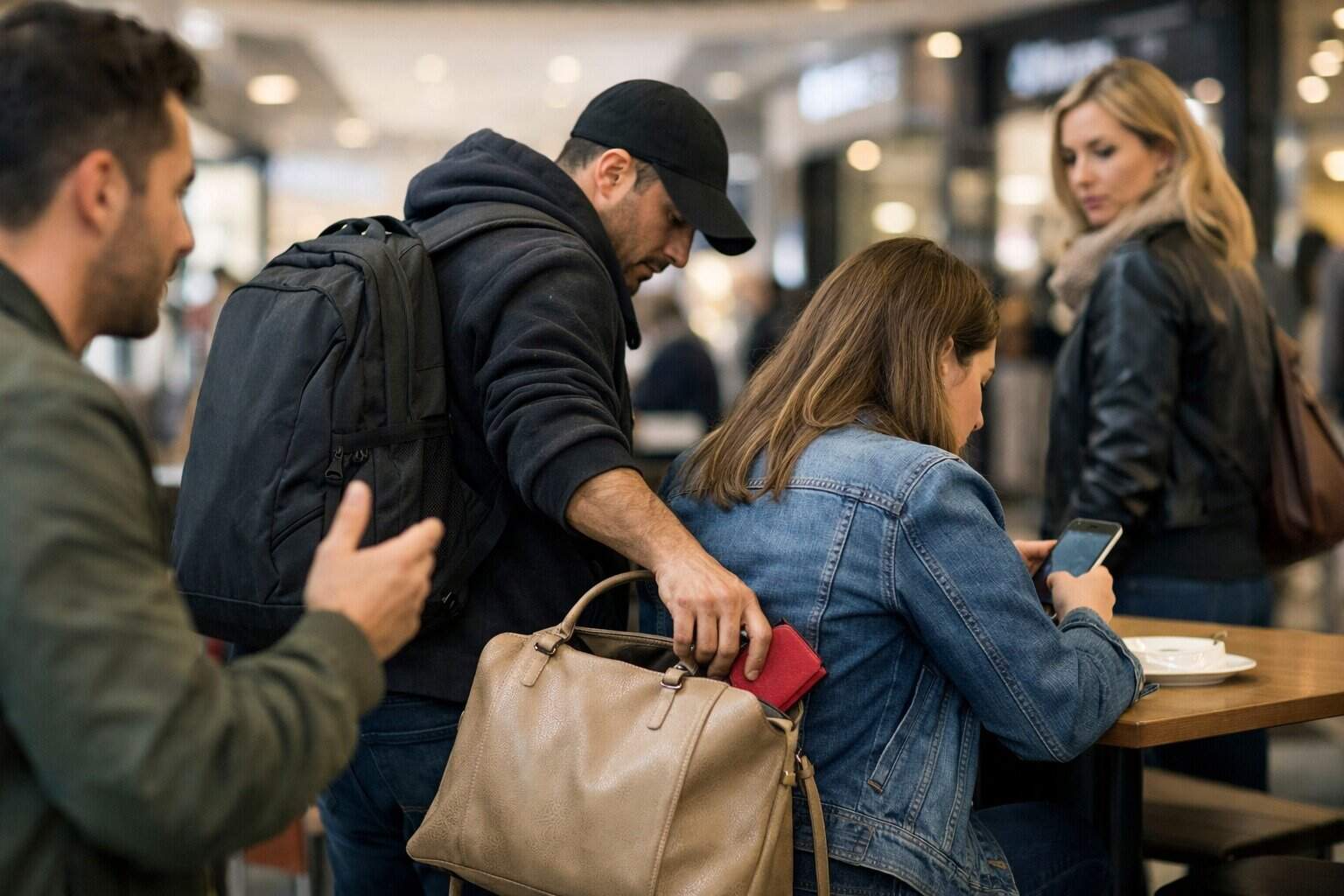 O ladrão aproxima-se da tua mesa. Muitas vezes finge ser um turista perdido, um angariador de assinaturas para uma causa de caridade (frequentemente fingindo ser surdo-mudo) ou alguém a vender algo.