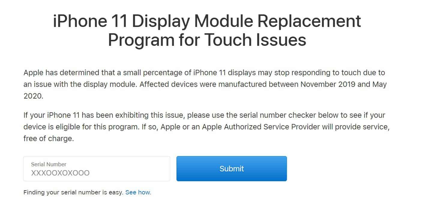 “A Apple determinou que existe uma pequena percentagem de iPhones 11 com ecrãs que podem mesmo deixar de responder ao input do utilizador. Os aparelhos afetados foram produzidos entre Novembro de 2019 e Maio de 2020.”