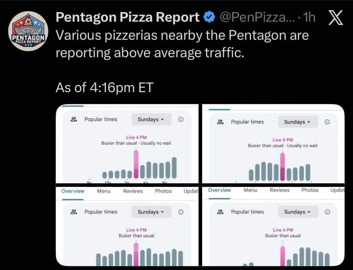 Claro que, eecentemente, voltou a circular nas redes sociais um alerta vindo de contas que monitorizam estes dados. Ou seja, várias pizzarias perto do Pentágono registaram tráfego acima do normal a meio da tarde, num domingo, algo pouco habitual.