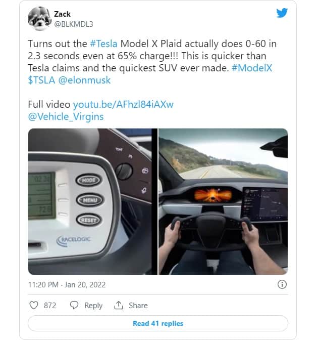 Com a utilização de um cronometro da Racelogic foi possível captar uma aceleração deste Model X Plaid de 1.020 cv de potência de 2.3s dos 0-100km/h e numa segunda tentativa o resulta foi de 2.5 segundos. Um facto curioso é que o carro estar, respetivamente a 65% e 64% de bateria.