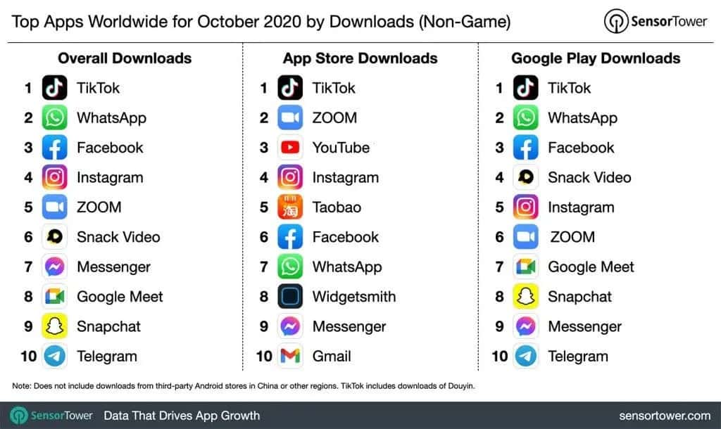 Em termos de downloads, o TikTok ainda ocupa a primeira posição. Assim somente em outubro de 2020, esta app de vídeos curtos atingiu os 66 milhões de downloads. Isto representa um aumento de 9,5% em relação ao mesmo período do ano passado.