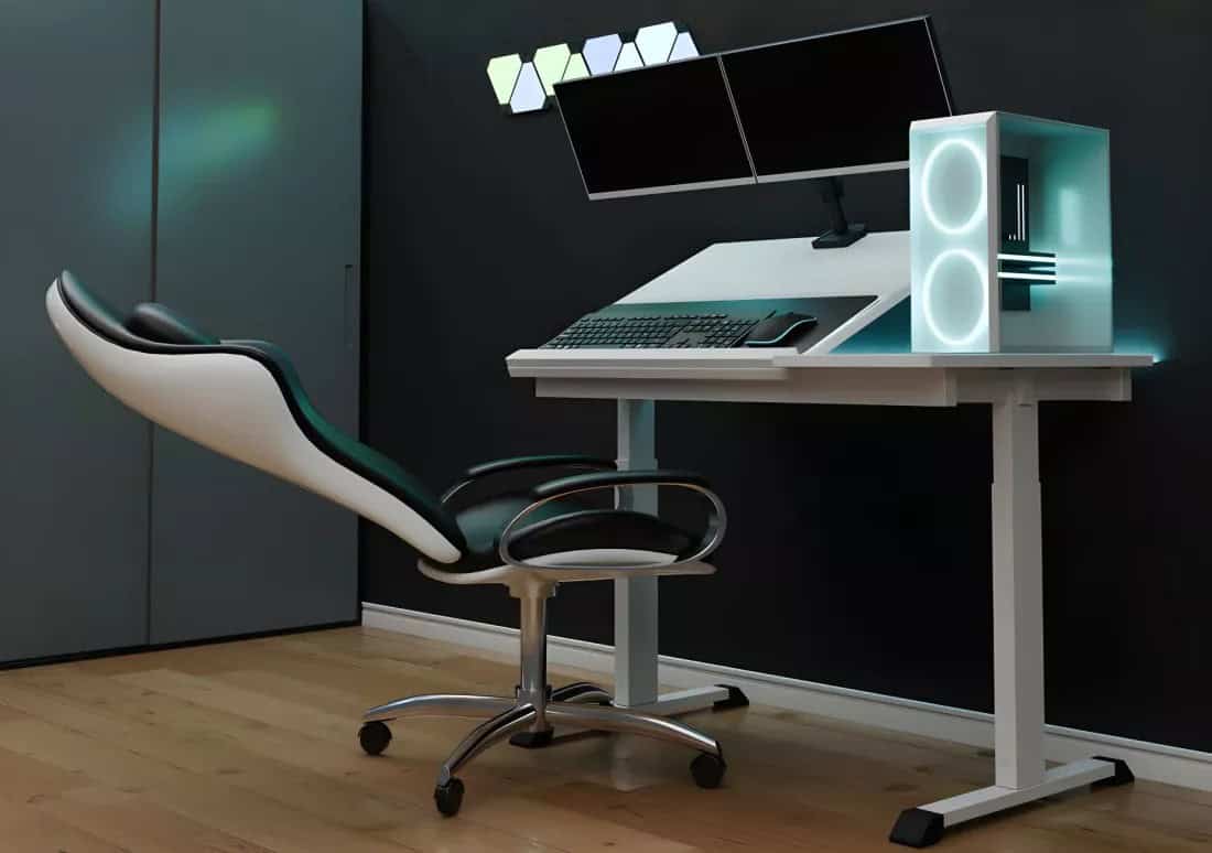 Isto pode parecer estranho, mas de facto existe agora a tentativa de produzir em massa um novo produto chamado de Ergo Desk, que basicamente é uma mesa elevatória, que além de subir e descer, também se inclina de forma a acompanhar a reclinação da sua cadeira gaming ou ergonómica.