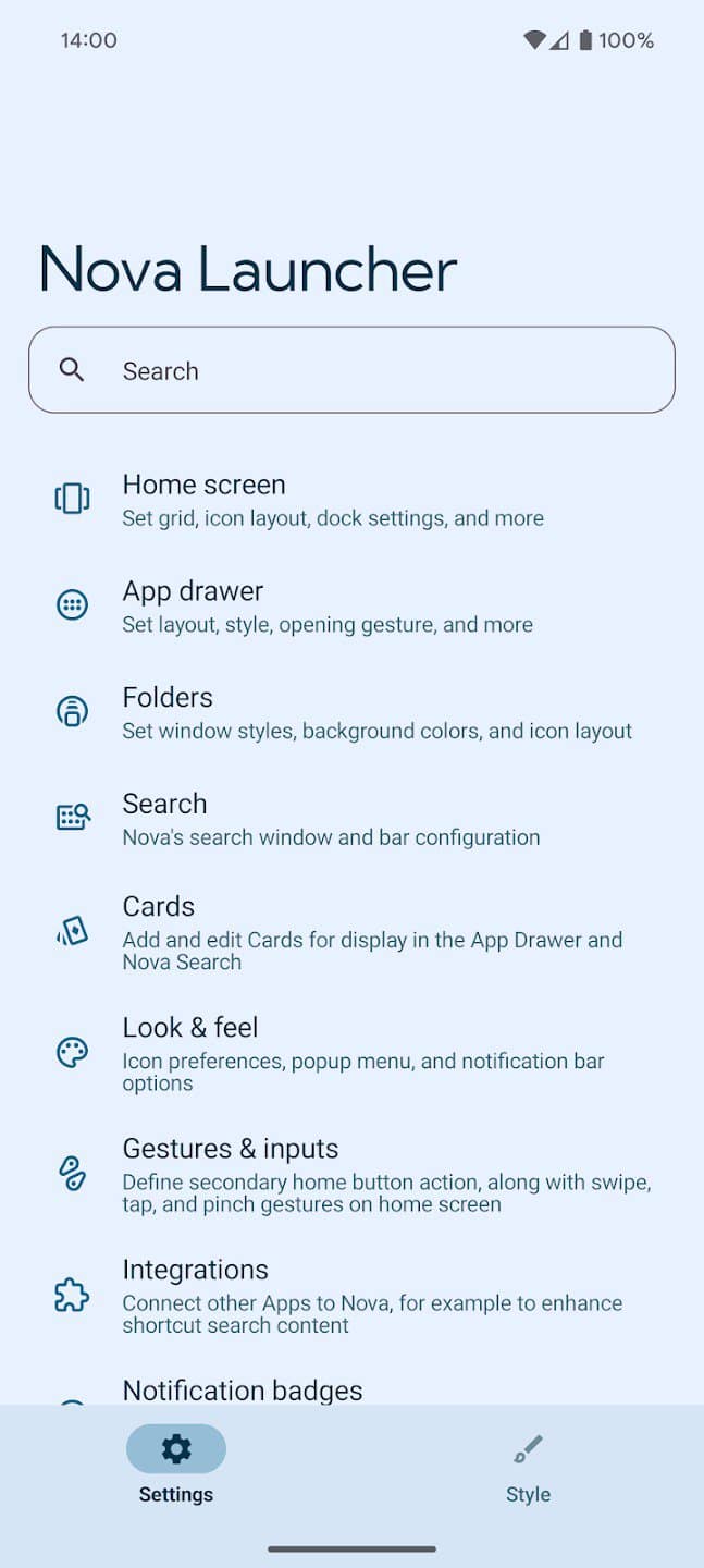 O Nova Search é agora ainda mais poderoso, graças às integrações Branch-powered, que permite aceder a atalhos de aplicações específicas diretamente da pesquisa, ou reencaminhar a sua consulta para o DuckDuckGo ou Google. Opcionalmente, a Pesquisa também está disponível na gaveta de aplicações. Os programadores também têm estado a testar o suporte Gemini.