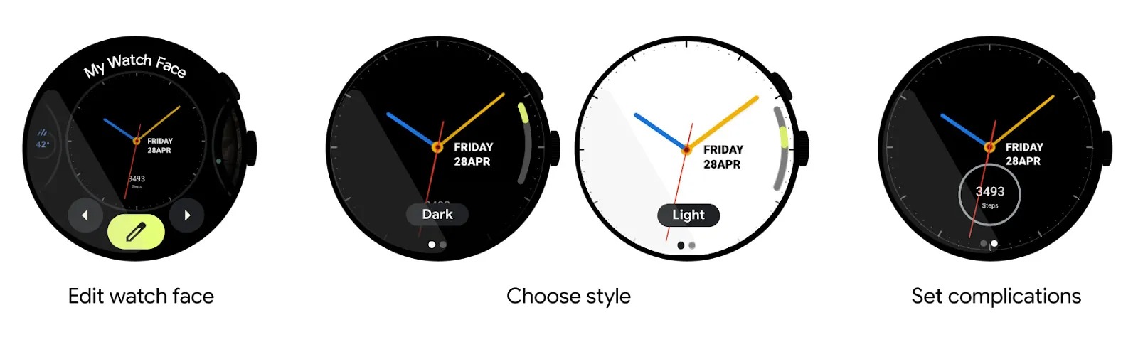 O Wear OS inclui também um editor de mostradores de relógio que funciona com o Watch Face Format. Assim os designers de mostradores de relógio já não precisam de criar o seu próprio editor dentro da aplicação de mostradores de relógio. Isto para permitir que os utilizadores personalizem os seus mostradores de relógio.