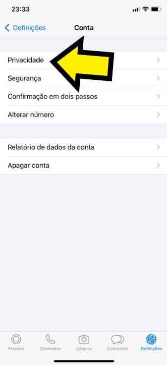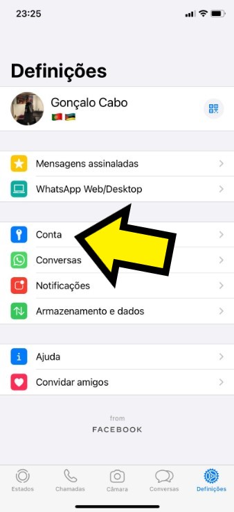 Primeiramente entre na aplicação do WhatsApp Mensseger e aceda as definições. No caso de possuir um iPhone, clique no seu canto inferior direito que estará lá. Mas caso tenha um dispositivo Android, clique nos 3 pontos em cima do ecrã e de seguida aceda às definições.