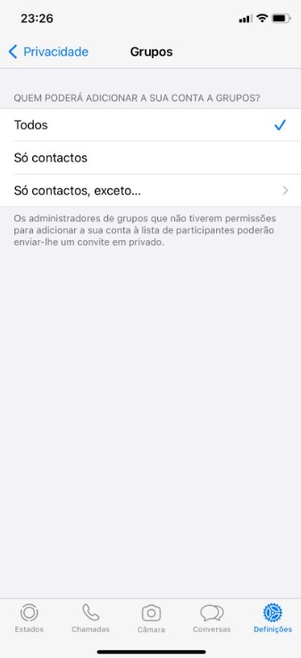 Por último, basta escolher a opção que deseja. Com a opção “Todos”, qualquer pessoa o pode adicionar a qualquer grupo, até mesmo desconhecidos que não tenha o número. Com a segunda opção, “Só contactos”, os seus amigos chatos podem vir a colocá-lo em grupos indesejados. E com a opção “Só contactos, exceto…”, só os seus contactos o podem adicionar, porém, pode excluir aquele seu amigo inconveniente de colocá-lo em todos os grupos e mais alguns.