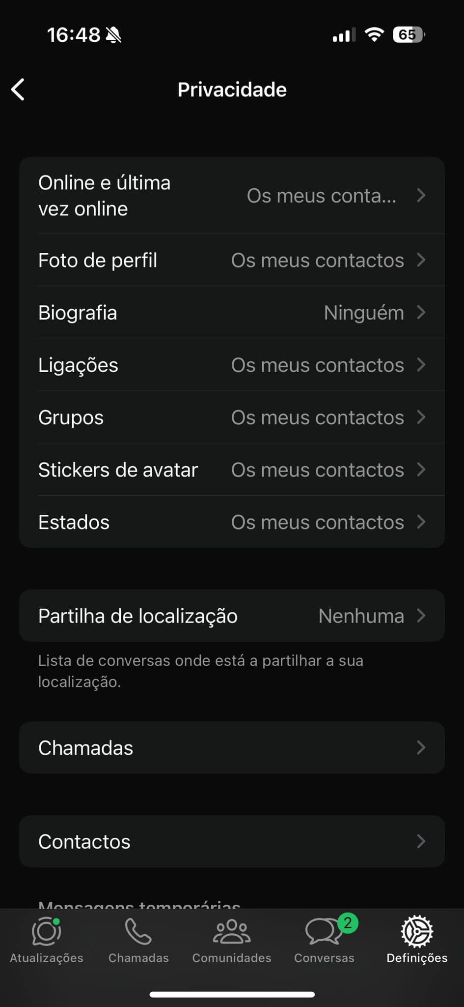 Vai a Definições > Privacidade. Em Visto por último e Online, seleciona: “Ninguém” ou “Os meus contactos”, em vez de “Todos”.