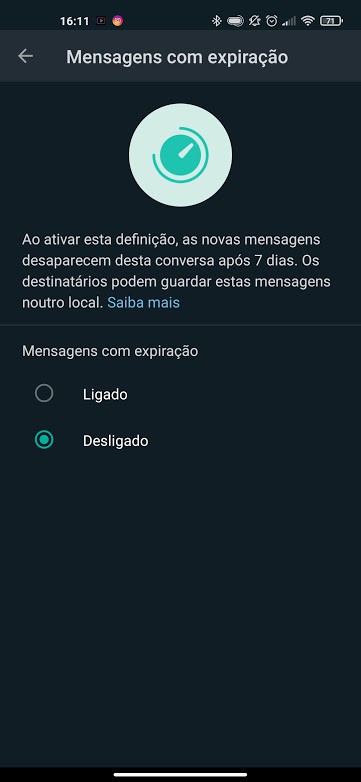 Assim que ativar a funcionalidade, todas as mensagens irão desaparecer ao fim de 7 dias. Contudo, se por ventura tiver o download automático de ficheiro ativo, irá ficar tudo no armazenamento interno do seu aparelho.