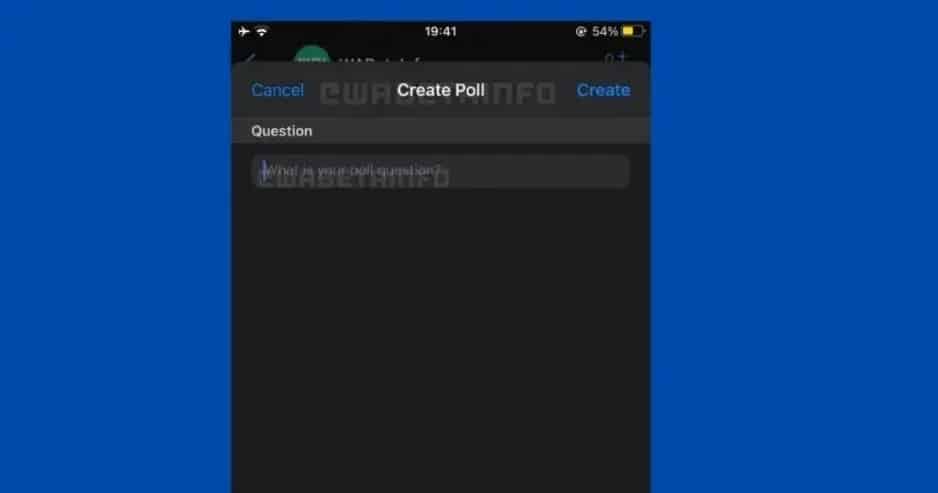 Assim como é possível ver na imagem, haverá uma nova interface de utilizador com um campo de texto para a pergunta. A isto junta-se o botão Criar, bem como um botão Cancelar. No entanto, uma vez que esta funcionalidade ainda se encontra em desenvolvimento, ainda não se sabe qual será o número máximo de opções. Também não se sabe se vão existir restrições quanto ao número de respostas ou durante quanto tempo poderemos votar numa sondagem.