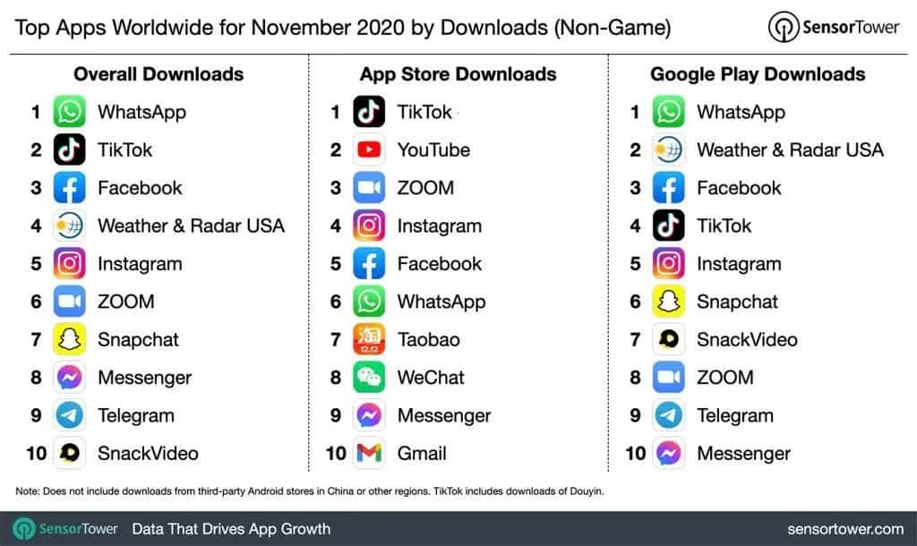 O Facebook é a terceira aplicação não relacionada com jogos mais descarregada no mundo em novembro de 2020. Pela primeira vez, o Zoom está fora do top 5 do ranking e foi substituído por Weather and Radar USA, que ocupa o quarto lugar acima do Instagram, em quinto.