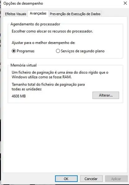 Depois escolha o separador Avançadas e em memória virtual escolha a opção Alternar. Mude a memória virtual para um número de maiores dimensões. A dimensão está em MB.