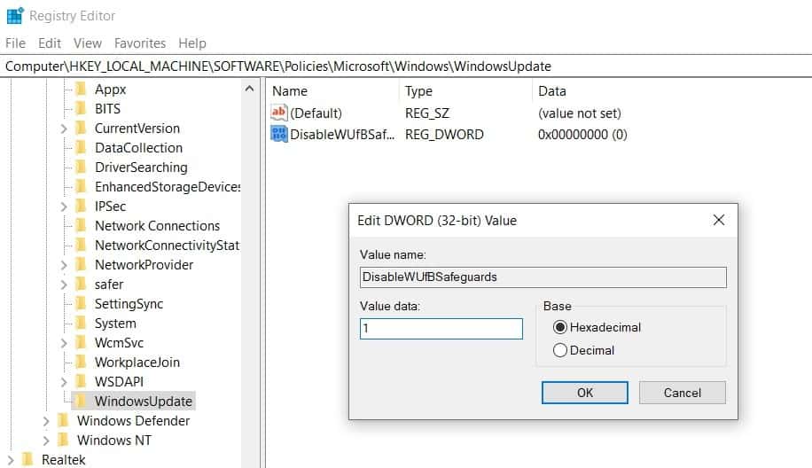 Abra o Editor de Registo. Depois abra a entrada HKEY_LOCAL_MACHINE\SOFTWARE\Policies\Microsoft\Windows\. Clique em Windows Update. Caso não tenha essa entrada crie uma. Usando o botão direito do rato crie um novo valor DWORD 32-bit e chame-lhe DisableWUfBSafeguards.