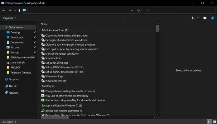 A imagem abaixo mostra que a interface do God Mode é baseada no layout do painel de controlo. Como é fácil perceber, permite rapidamente configurar as definições do Windows.