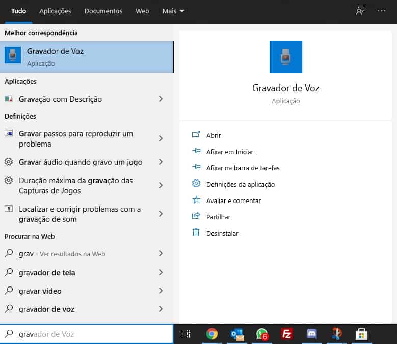 Em primeiro lugar utilize o menu para localizar a aplicação ou para ser mais rápido comece a escrever gravador na barra de pesquisa. Depois é só dar um clique na aplicação para a abrir.