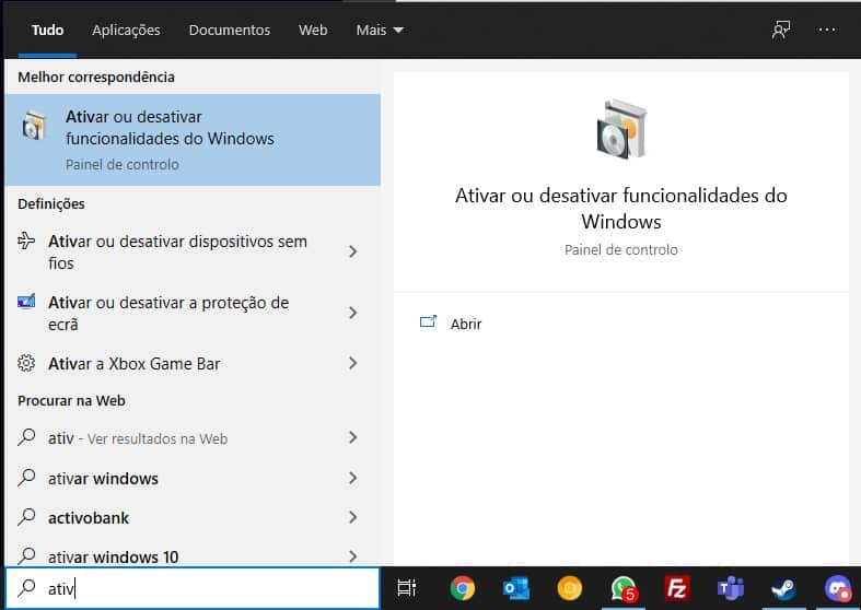 Para instalar o módulo tem de estar na versão Pro do Windows 10. Assim comece a escrever na pesquisa ativar ou desativar e vai aparecer a opção ativar ou desativar funcionalidades do Windows. Clique em Abrir do lado direito.