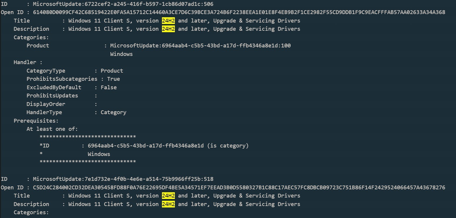 Como mostrado na captura de ecrã acima, a parte de código revela que a atualização é destinada ao Windows 11, Windows 11 Client S (PCs no modo S) e Windows Server. A Microsoft criou internamente uma categoria “versão 24H2” no WSUS, o que sugere que o lançamento final.