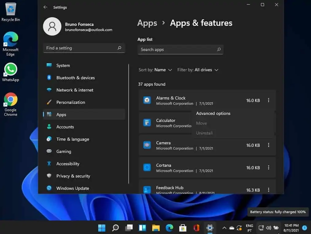 Entretanto vai ver que surge uma grande lista de apps. Aí clique nos três pontos à frente da aplicação onde quer mexer e depois clique em Advanced Options.