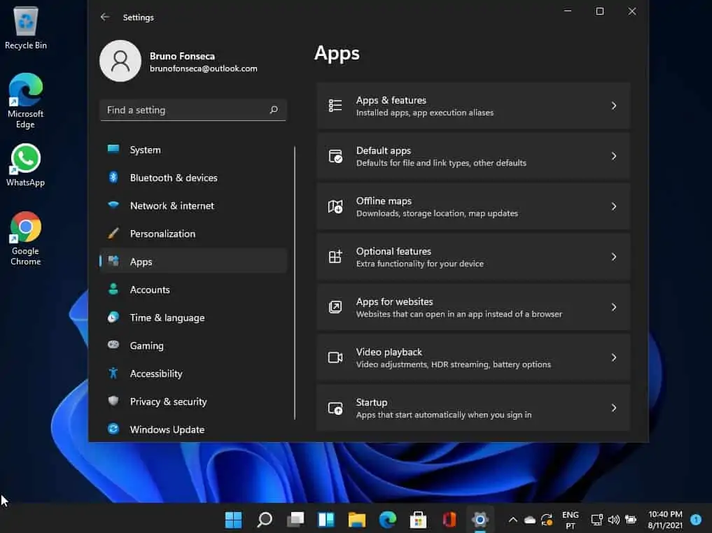 Logo a seguir clique em apps do lado esquerdo. Depois na janela do lado direito escolha a opção Apps & Features.