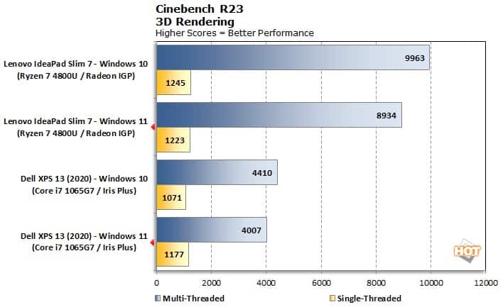 No caso do Cinebench R23, os resultados divergiram pouco entre as diferentes versões. Mas ao processar vários fluxos de dados, o Windows 11 mostrou uma diminuição de desempenho de cerca de 10% em comparação com o antecessor.