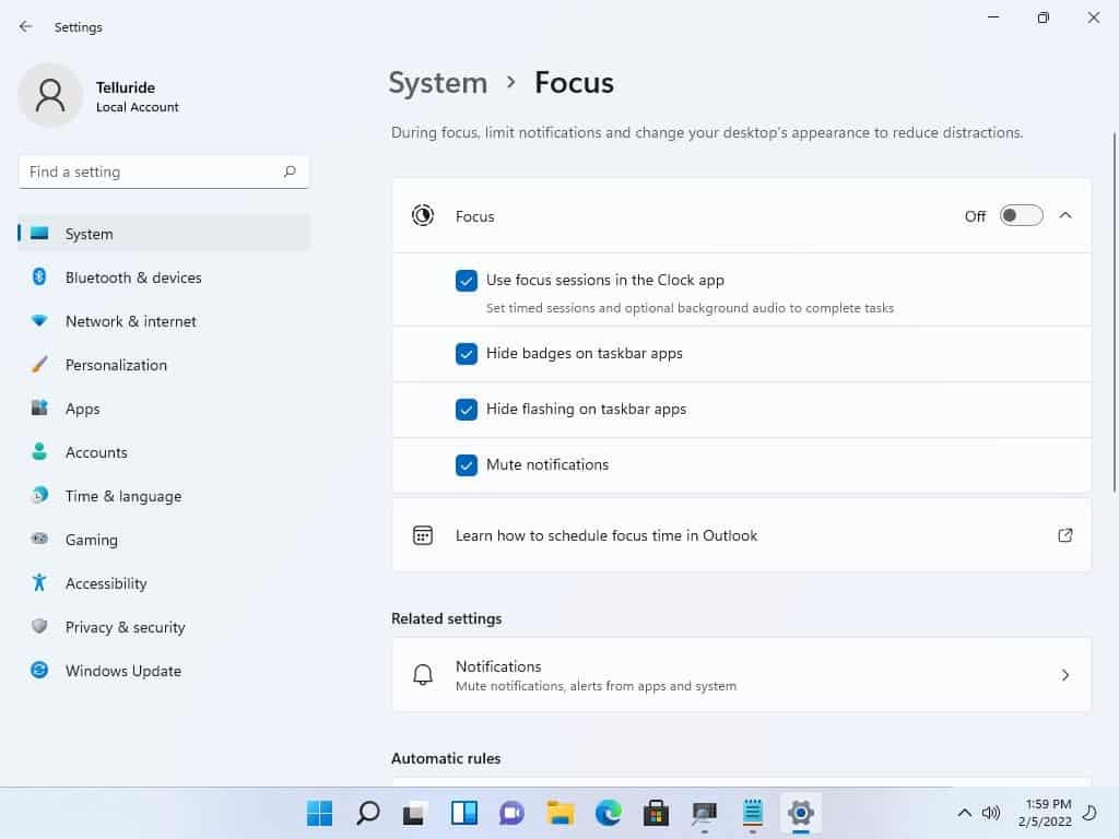Logo à partida esta página de assistência à concentração tem agora mais opções disponíveis. Por exemplo, podemos desativar esta funcionalidade na app de relógio. Também podemos esconder as notificações e chamadas de atenção na barra de tarefas. As notificações também podem deixar de ser mostradas e irem diretamente para o centro de acção.