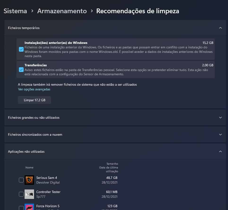 Clique em Ficheiros temporários e se estiver tudo bem com o sistema operativo pode apagar os ficheiros de instalações anteriores. Entretanto pode também apagar as transferências.