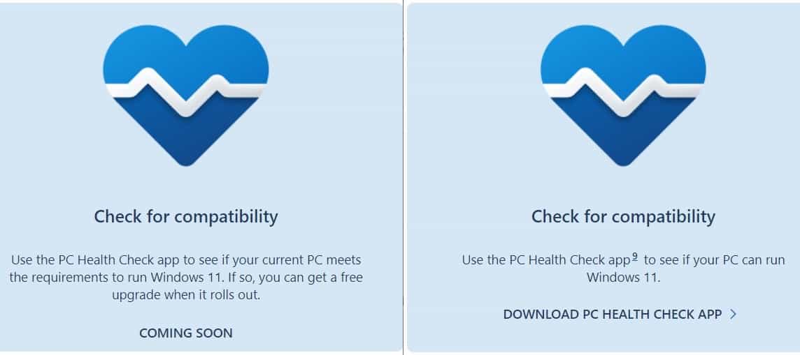 A ferramenta PC Health Check foi disponibilizada na última semana de Junho, mas foi retirada depois das pessoas terem detetado muitos problemas na app. A app foi depois relançada para alguns Windows Insiders para teste antes de chegar ao público em geral.