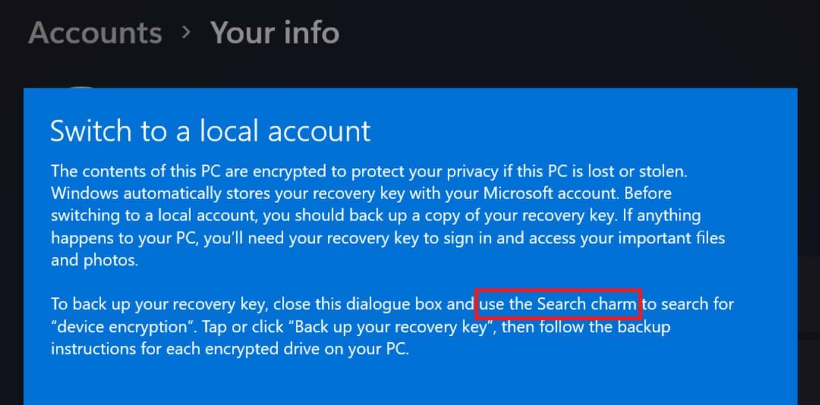 Era uma funcionalidade exclusiva do Windows 8 que já não está presente nas versões atuais do Windows. No entanto, as instruções para efetuar a cópia de segurança de uma chave de recuperação no processo “Mudar para uma conta local” continuam a aconselhar os utilizadores a “utilizar este sistema para para procurar ‘encriptação do dispositivo'”.