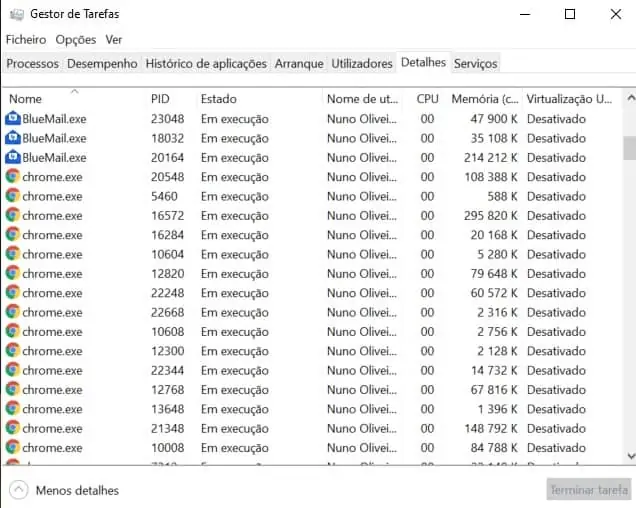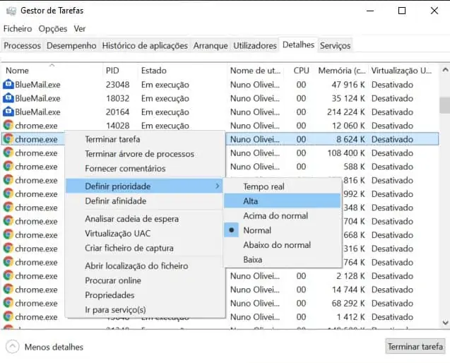 - Carregue com o botão direito do rato, na aplicação que quer aumentar o desempenho, neste caso, alocar mais RAM. Para isso, escolha ‘Definir Prioridade’ e posteriormente escolha ‘Alta’ ou ‘Acima do normal’.