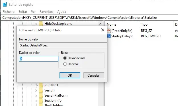 Portanto, clicamos duas vezes no registo StartupDelayInMSecvalue e garantimos de que o valor esteja definido como 0 na caixa “Value data”, conforme a imagem abaixo.