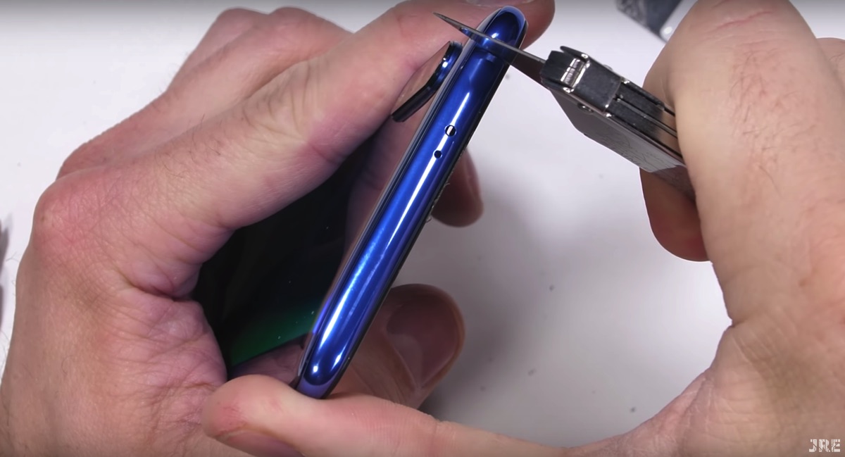 O teste começou com o teste de riscos. Um aspeto importante é que o ecrã e o vidro em redor sobreviveram aos riscos feitos com um X-ato sem qualquer marca.