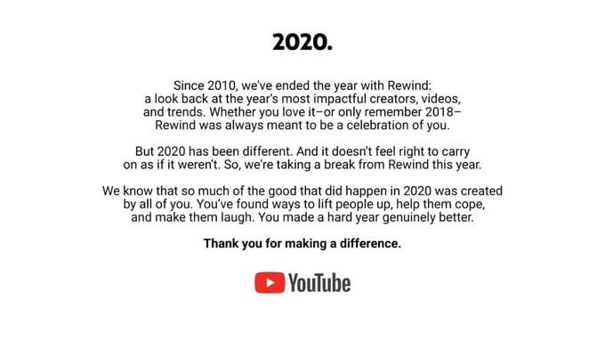 O YouTube Rewind é um vídeo feito pela Google que assinala as tendências e vídeos virais mais proeminentes do ano. O vídeo de final de ano é uma tradição desde 2010, mas este ano o YouTube anunciou que não haverá Rewind 2020. Num tweet revelado hoje, o YouTube anunciou que não iria apresentar nenhum Rewind em 2020, devido ao ano estranho que estamos a viver.