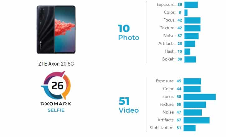 A análise feita pelo DxOMark refere que a câmara de 32 megapixéis do Axon 20 sofre de inúmeros problemas que afetam a qualidade de imagem. Isto apesar da exposição e da focagem até não serem más de todo. Se separarmos a pontuação, temos 10 pontos para as fotos e 51 para o vídeo.